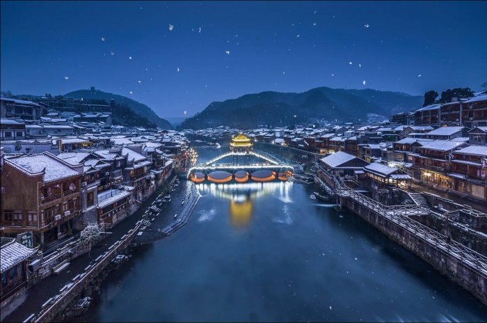 冬季住在凤凰古镇,最意外的惊喜是拉开阳台帷幔时,映入眼帘的是银色的世界,洁白的雪花铺满了整个大地,近处客栈和小店的黛瓦盖上一层皑皑白雪,妙不可言。