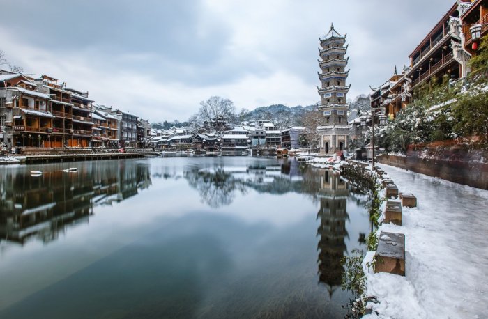 冬季住在凤凰古镇,最意外的惊喜是拉开阳台帷幔时,映入眼帘的是银色的世界,洁白的雪花铺满了整个大地,近处客栈和小店的黛瓦盖上一层皑皑白雪,妙不可言。